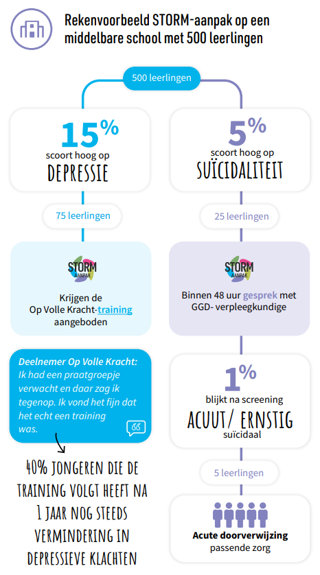 Met STORM zetten we ambitieus in op het vergroten van de mentale veerkracht onder jongeren en op het voorkomen van grotere problemen door gerichte samenwerking tussen onderwijs en zorg: minder kosten, door een vroege signalering en snelle, beschikbare en effectieve hulp waar nodig.